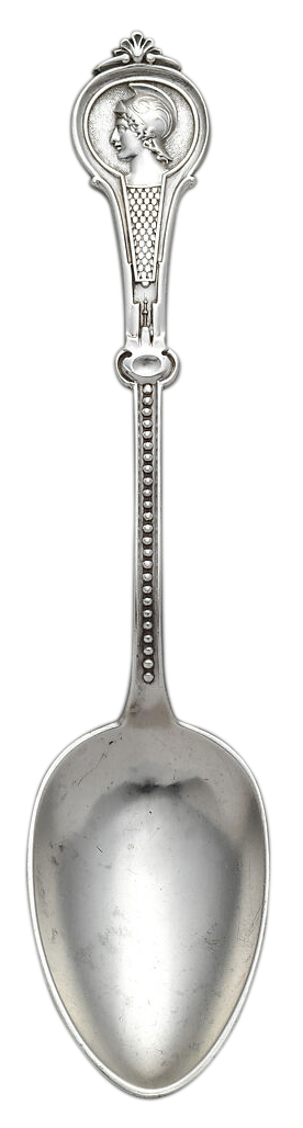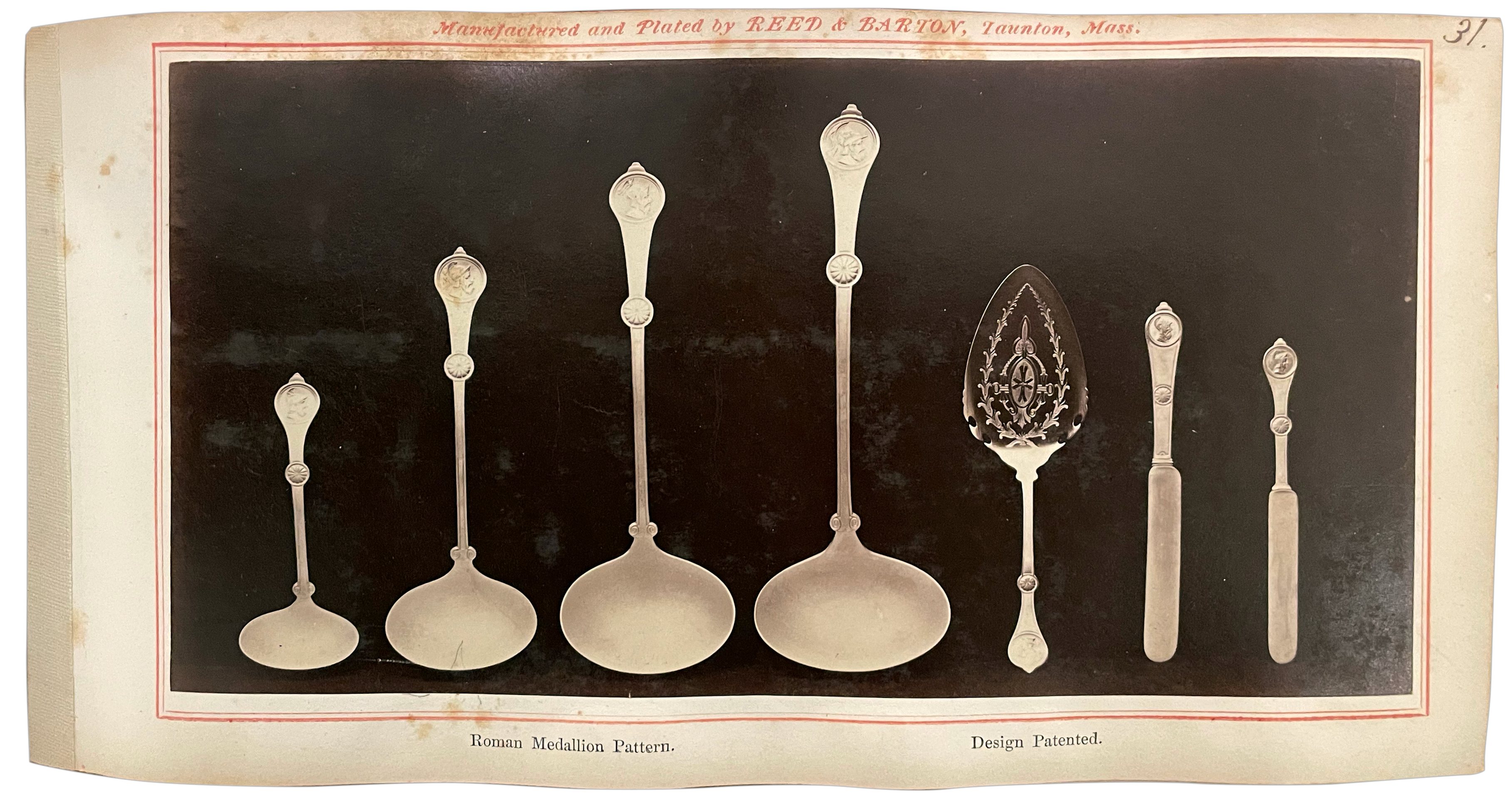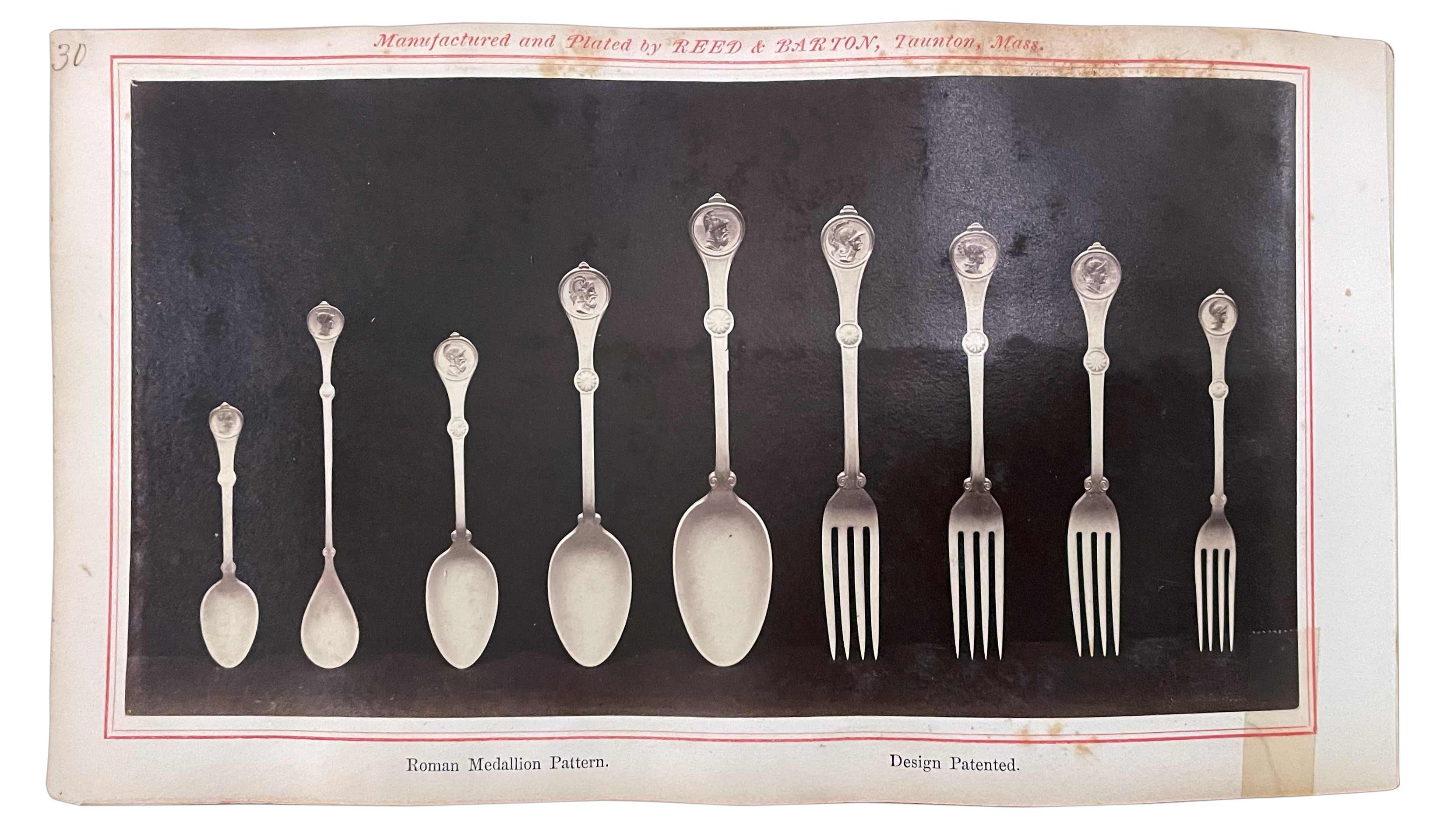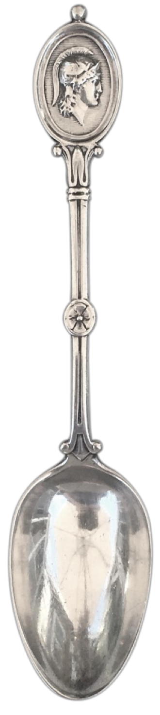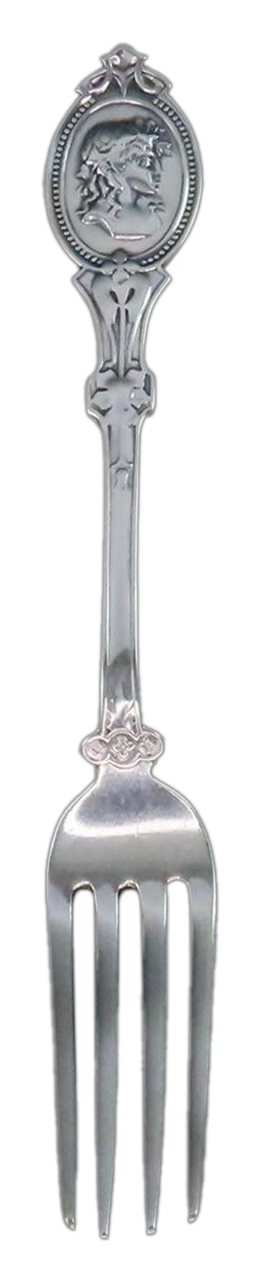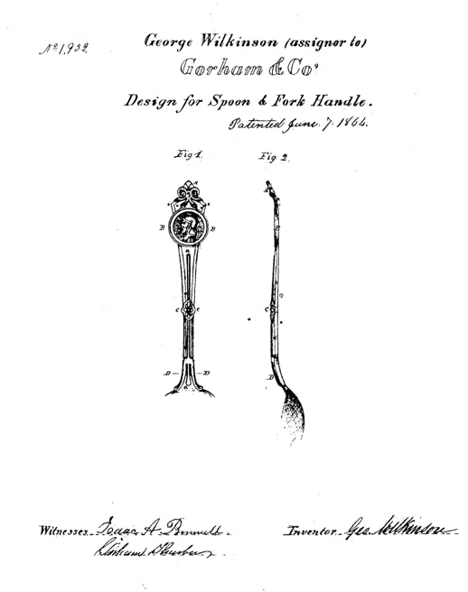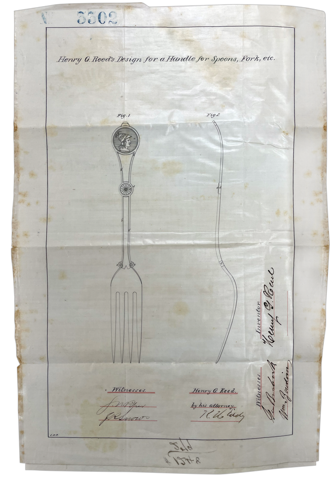 US Design Patent number 3,302, granted Dec 29, 1868 to Henry G. Reed, shows a fork with a portrait medallion featuring a Roman soldier. This suggests that Reed & Barton originated what became an extremely popular flatware pattern. But they did not!