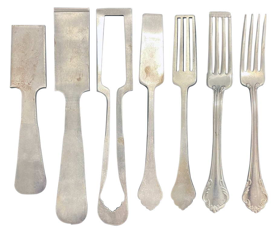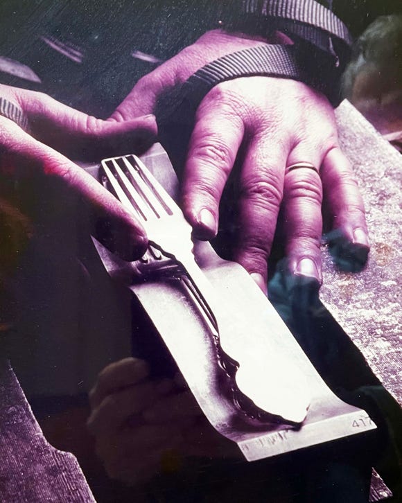 Starting in the 1840s, the look of a hand-hammered, high-end spoon or fork could be replicated with manufacturing by running metal through a series of custom-carved steel roller dies.
