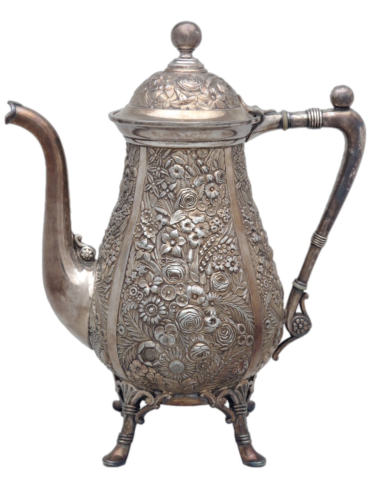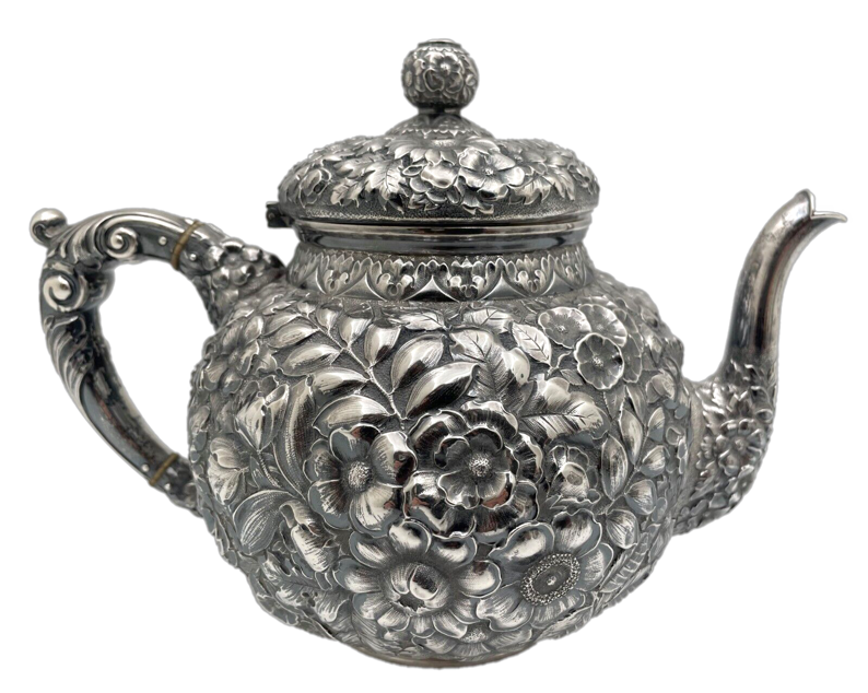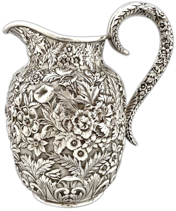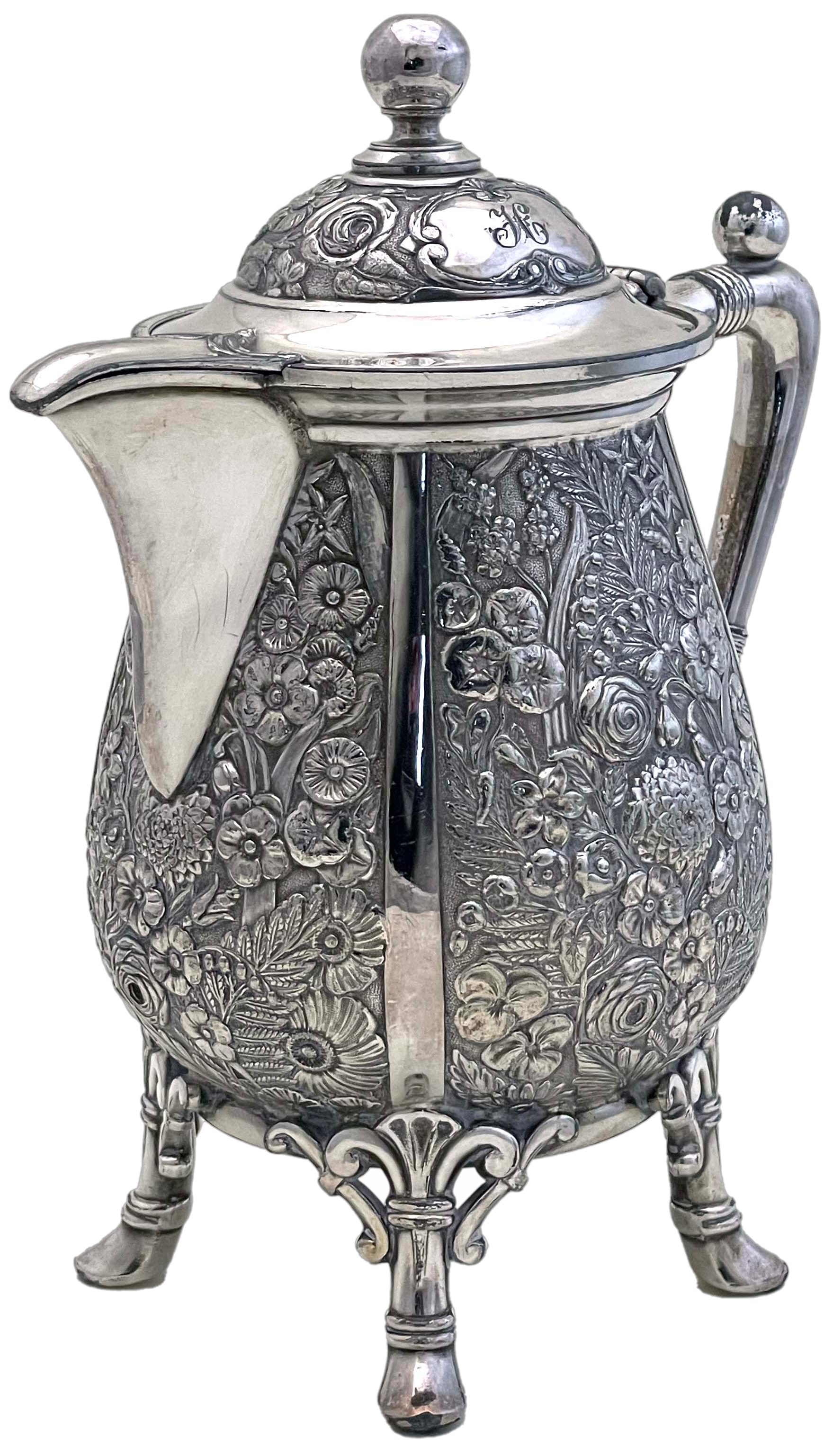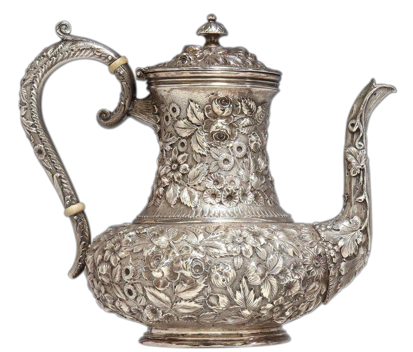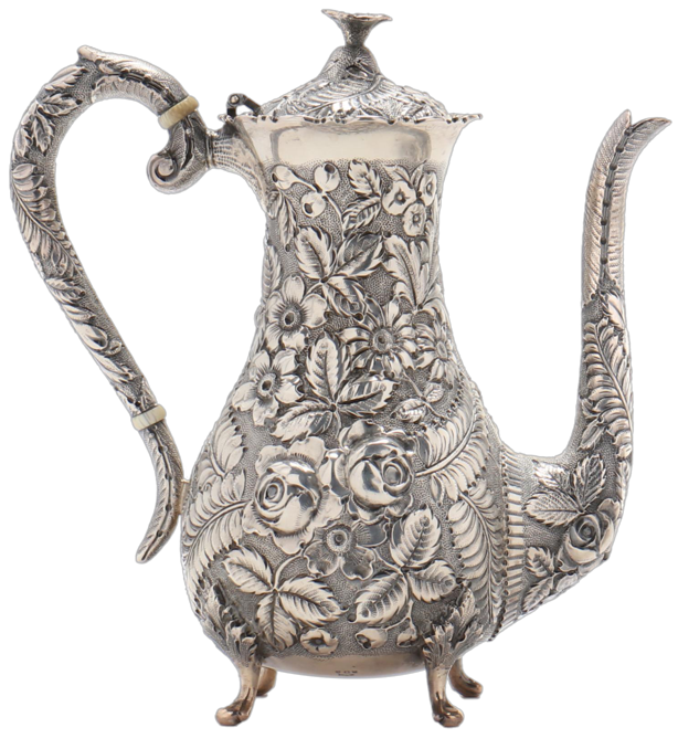 In 1828, Baltimore silversmith Samuel Kirk introduced new designs with surfaces completely covered in three-dimensional flowers. This floral pattern, now referred to as Repoussé, or Baltimore Repoussé, or even just as Batlimore Silver, was made by hand hammering the pattern into the surface. Kirk’s extraordinary silver established a new standard for silver work and for luxury.