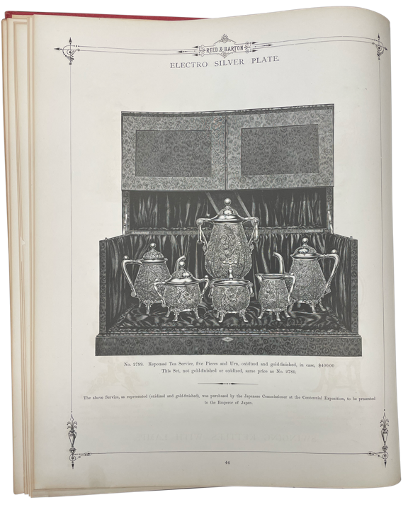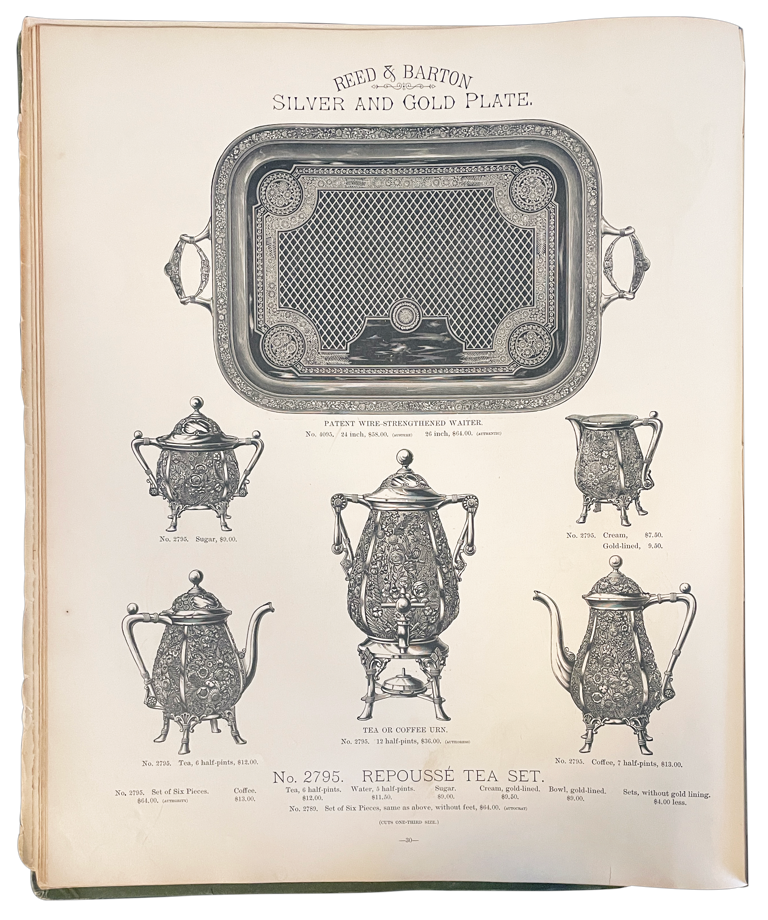 It could also be purchased in a gold finish, with a storage/presentation box for $400. The catalog notes that this upgraded option matched the set purchased by the Japanese Commissioner at the 1876 Philadelphia Centennial Exposition, to present to the Emperor of Japan. All of this confirms that the smallest consideration in purchasing a Reed & Barton Repoussé tea set was its actual function.