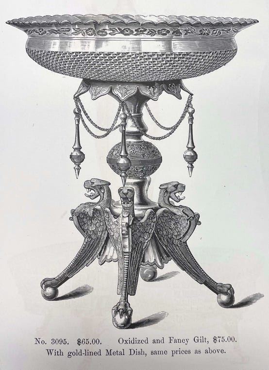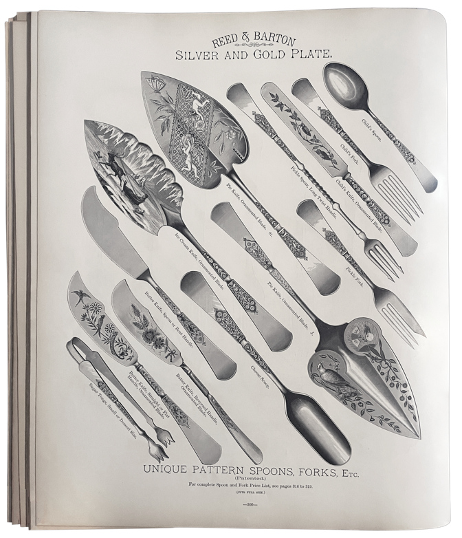 It is easy to marvel today at the sheer quantity of items Reed & Barton offered for sale; the 1877 catalog contains many hundreds of products. A well-set table might not NEED an epergne, covered butter dishes, elevated fruit stand, napkin rings, cake basket, tilting water dispenser, ice bowl, revolving condiment holder, pickle jar, salad casters or flatware sets with dozens of different forks and spoons created specifically for certain foods.