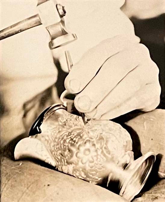 This process, called repoussé, uses hammers and small steel punches to push metal out from the inside of a formed vessel. Then details are refined by pushing the metal back inward from the outside (called chasing). All of this takes time and requires great skill, leading to high prices.