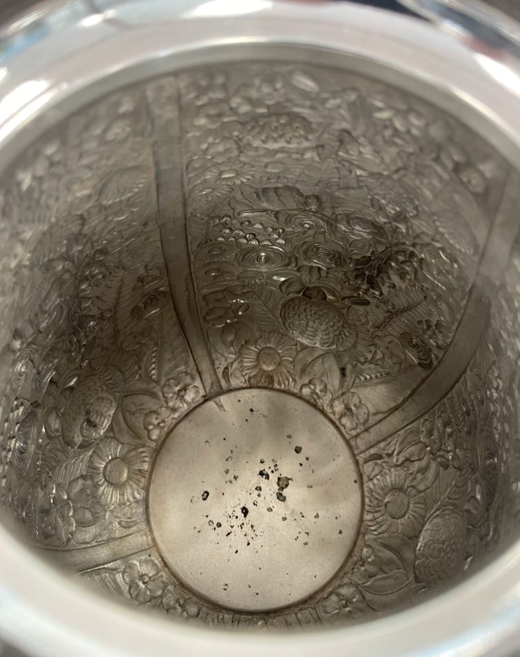 Silver plating helps hide all of the joints, giving the impression of one-piece construction. On the inside, this patchwork construction is obvious. But on the outside, it looks every bit as hand made and luxurious as the original silver it was replicating.