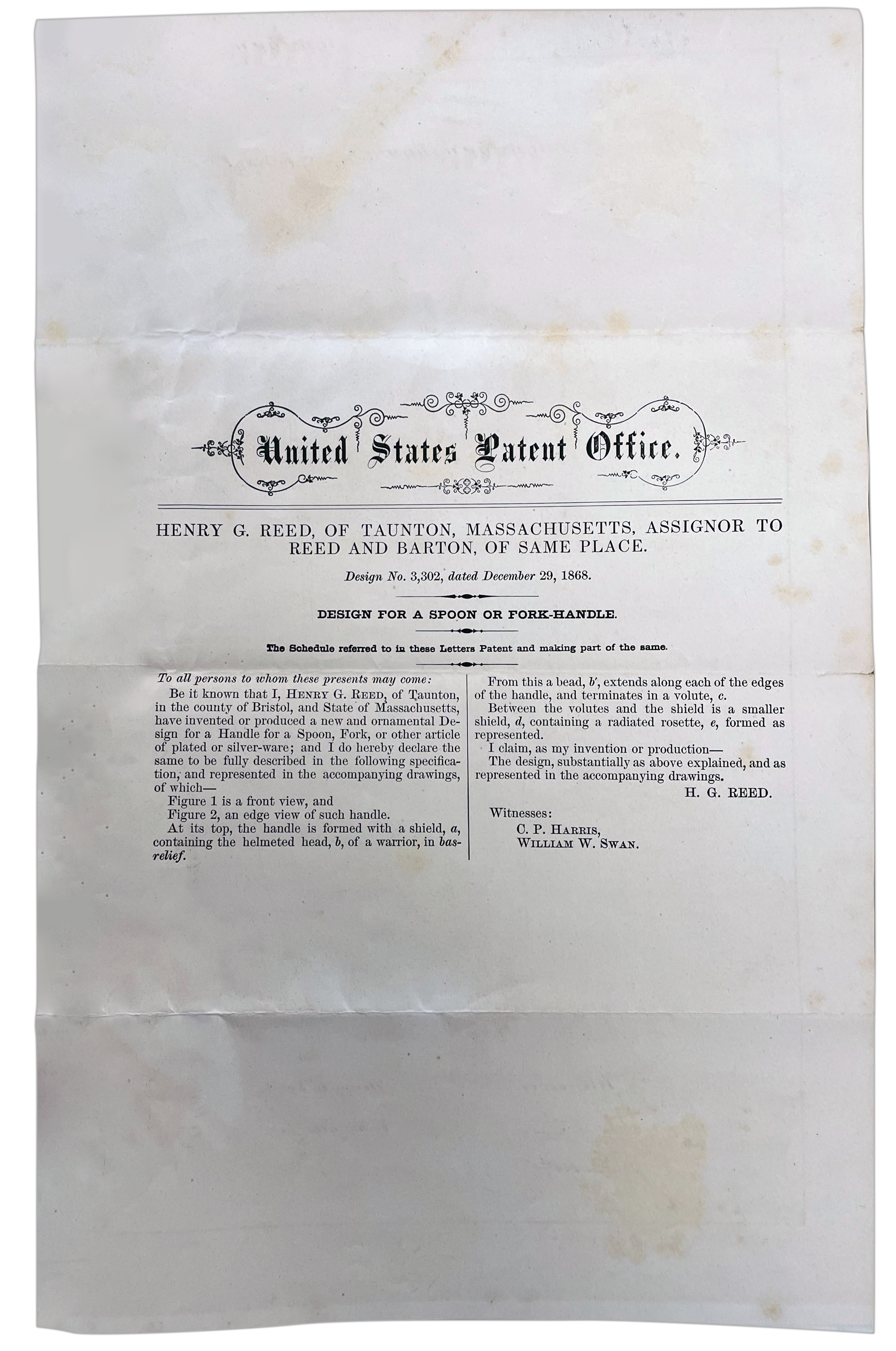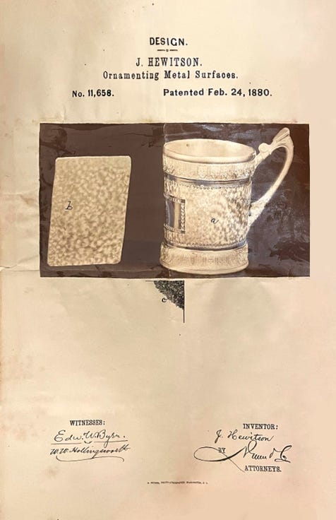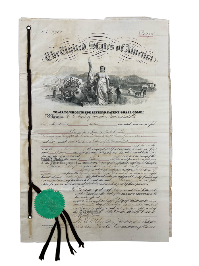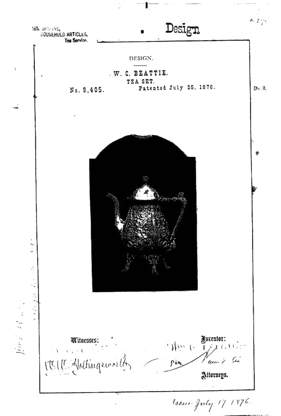 Henry Reed began using the US Patent system to register, promote, and protect Reed & Barton designs in 1860. With a combination of utility patents covering manufacturing methods, electroplating technologies, and metallurgical advances, and design patents covering aesthetics, shapes, and patterns, the company’s history can be charted through its filings. Because the development of the company paralleled the development of the US patent office, the combined Reed & Barton patents beautifully illustrate the history of the entire patent system and its regulations. Link below to complete database of Reed & Barton US Patents.