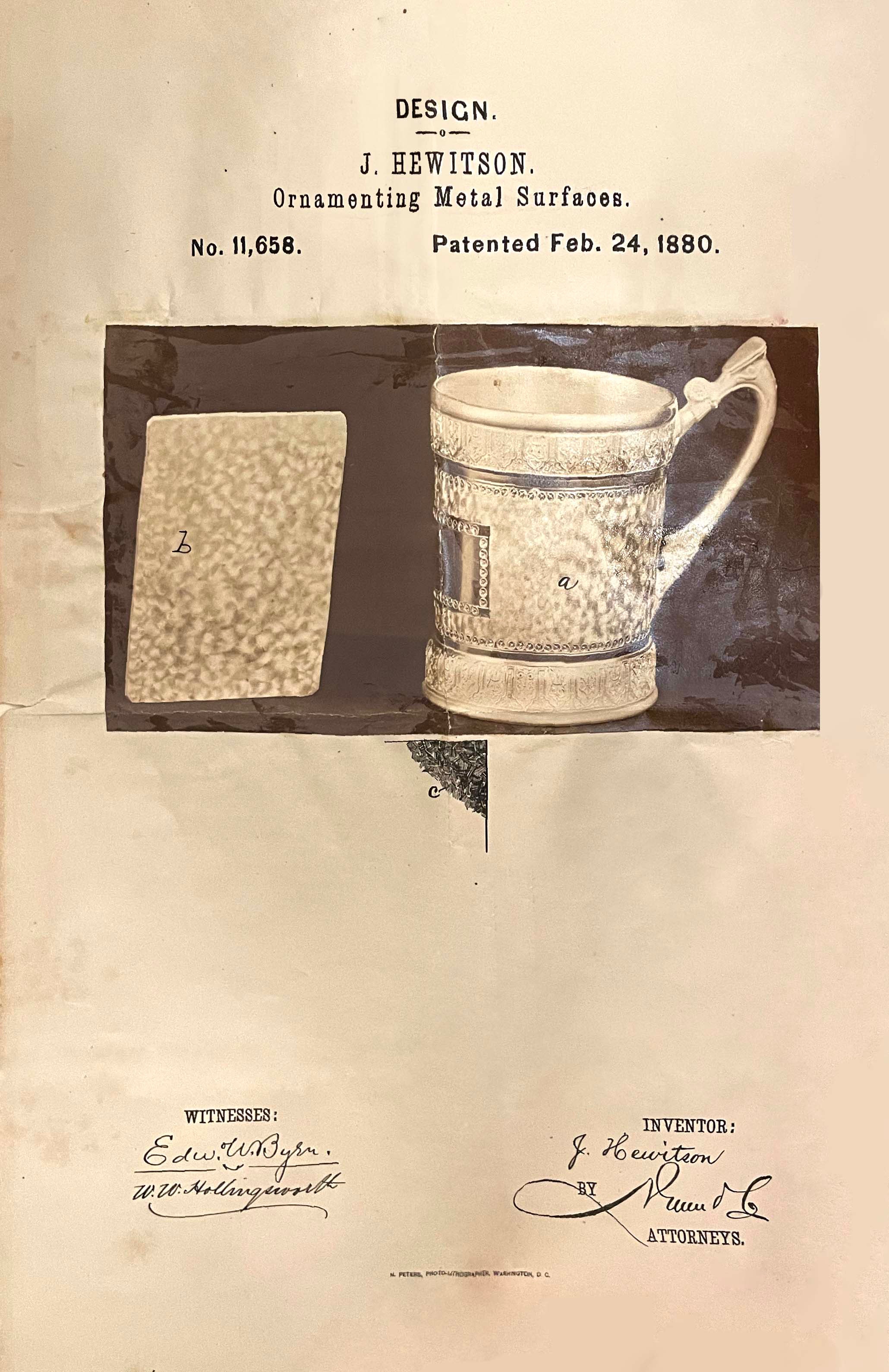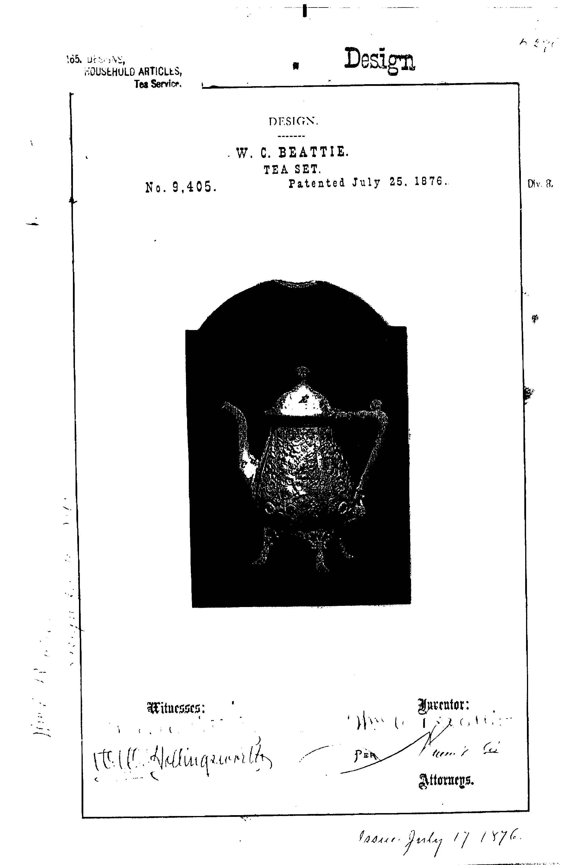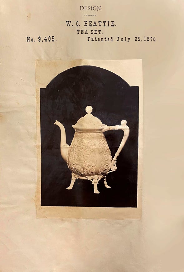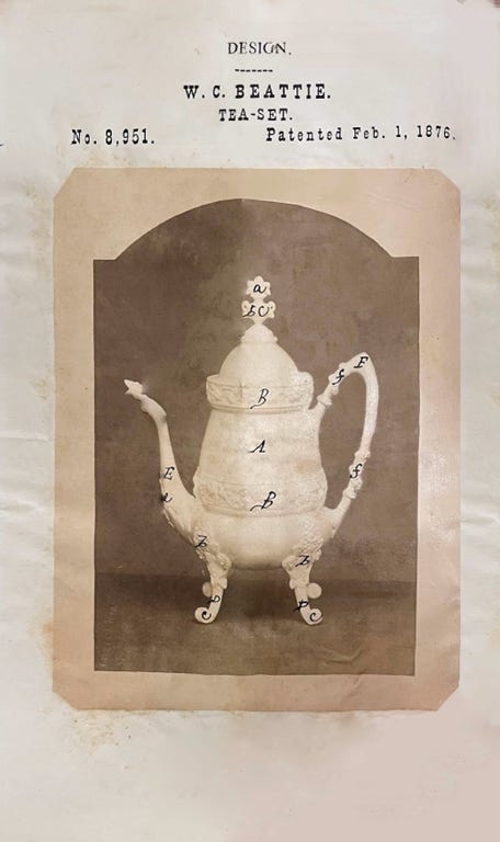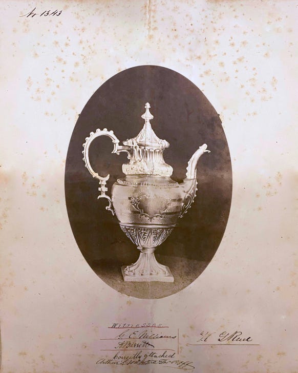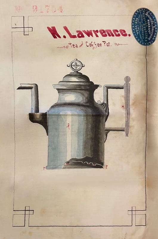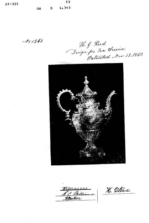 Because Reed & Barton had its own in-house photography department, the company filed many design patents with photographs tipped in. This was allowed, but not often used; most applicants did not have the resources to do so. These patents have also suffered in digitization; the photographs were scanned automatically and are now often unintelligible (see below). Henry Reed’s earliest filed patent, from 1860, includes a photograph of the patented teapot. Compare the original from Harvard with the version available on the Google Patent database: