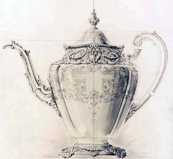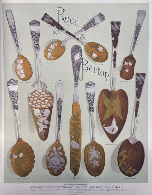 George Brabrook became a partner in the company in 1859 and introduced a new level of business, sales, and financial oversight, creating the first proper design department in 1873 and importing designer W.C. Beattie from England to lead it. By 1889 there were 24 designers creating the thousands of new designs promoted at global expositions and in extraordinary print catalogs issued by Reed and Barton in 1877 and 1884. The US Navy began a long relationship with Reed & Barton which then produced all of the flat and hollow ware used on ships through the end of WWII.